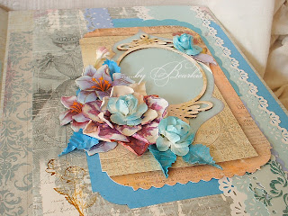 Любимите цветове на момичето-нежносини. . .Цветята са готови и ръчно изработени. Другото-по усет. . .с парчета дизайнерска хартия